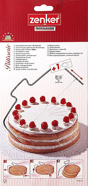 Приспособление для аккуратной нарезки бисквитного торта. За счет удобных мягких пластиковых ножек – оснований струна движется по поверхности стола равномерно. Этим самым Вы получаете одинаковые и ровные части бисквита. Легкий и прочный, так как выполнен из нержавеющей стали. В комплекте 2 струны, вторая запасная.